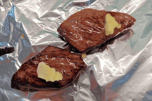 Мясо выложить сверху и смазать его остатками сливочного масла. Завернуть в фольгу и оставить на 7 минут.