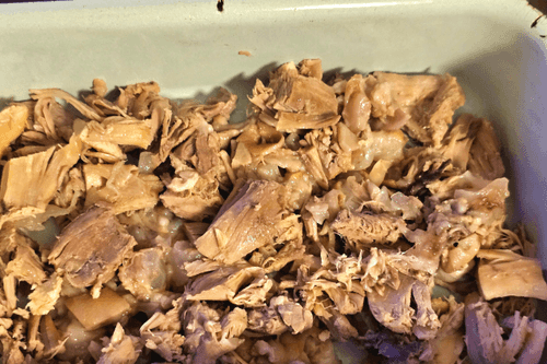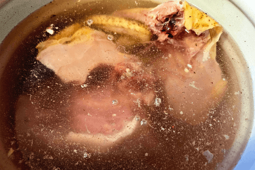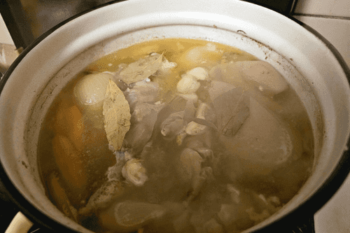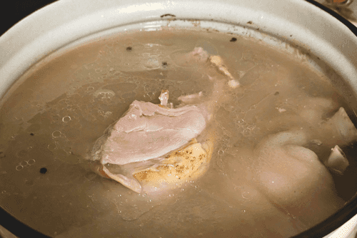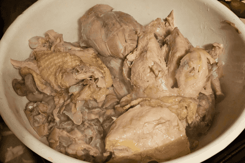 Вытащить мясо. Овощи выкинуть. Дать немного остыть бульону.