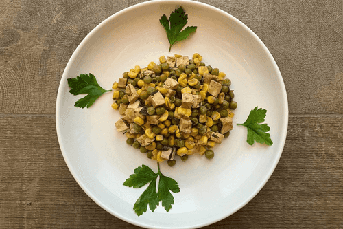 Тофу с овощами — это легкое, но питательное блюдо, в котором азиатские вкусы гармонично сочетаются с русскими кулинарными традициями. История его происхождения связана с адаптацией вегетарианских рецептов на просторах России, где свежие и замороженные овощи стали неотъемлемой частью кухонного искусства. Нежный вкус тофу впитывает сладость кукурузы, мягкость горошка и аромат свежей зелени, а пикантный соус терияки с оттенком сладкого чили добавляет блюду выразительности. Запеченные ингредиенты приобретают насыщенный вкус, а адыгейская соль подчеркивает их натуральность. Это блюдо подходит как для будничного ужина, так и для праздничного стола, радуя своей универсальностью и аппетитным видом. Подавать рекомендуется горячим, украшенным свежими листочками петрушки для завершающего штриха.