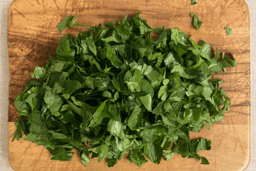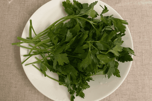 Оборвать листочки петрушки с веточек и мелко нарезать.