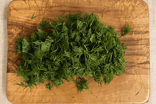 Оборвать листочки укропа с веточек и мелко нарезать.