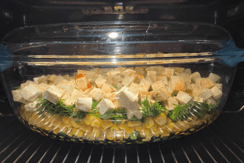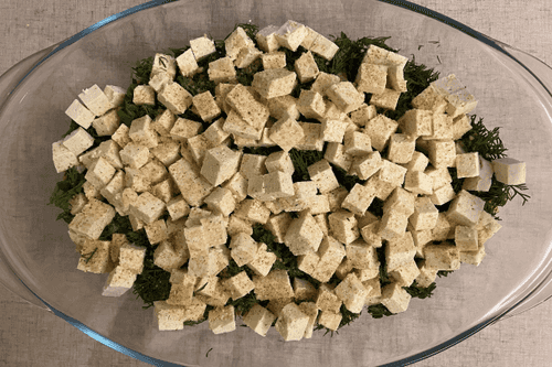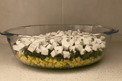 Выложить овощи, зелень и тофу слоями в форму для запекания.