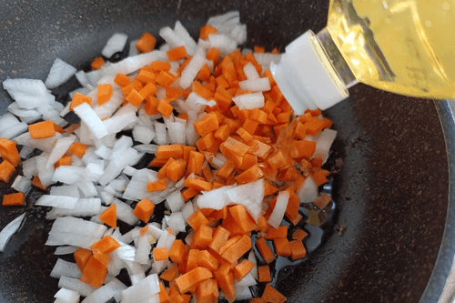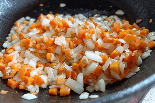 Обжарить до прозрачного состояния лука и полуготовности моркови.