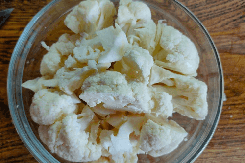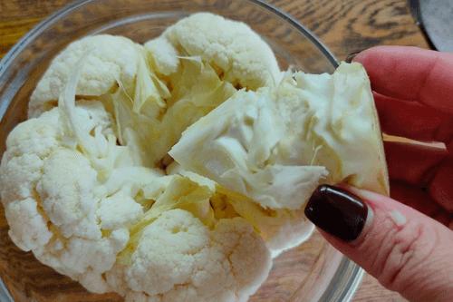 Цветную капусту перевернуть вниз соцветиями в миску и вырезать кочерыжку.