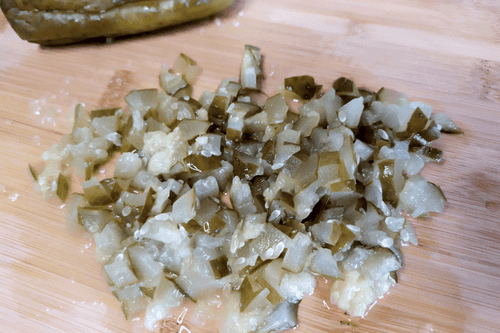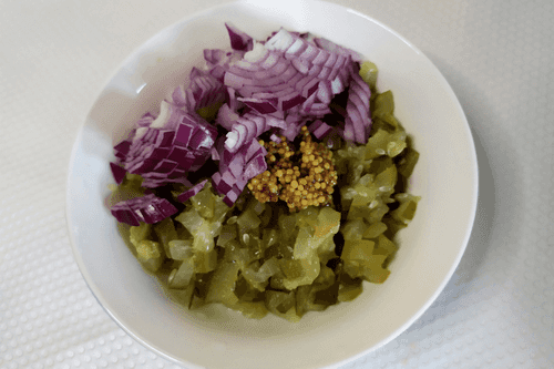 Соединить огурцы, мелконарезанный красный лук, 1 чайную ложку дижонской горчицы и 1 чайную ложку растительного масла. Размешать.