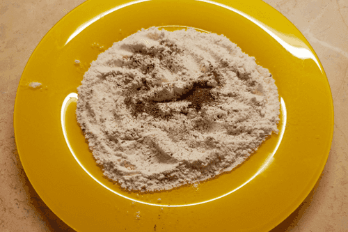 Соединить муку, соль и перец.
