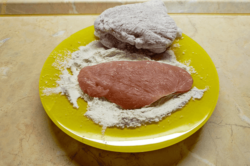 Обвалять отбивные в мучной смеси.