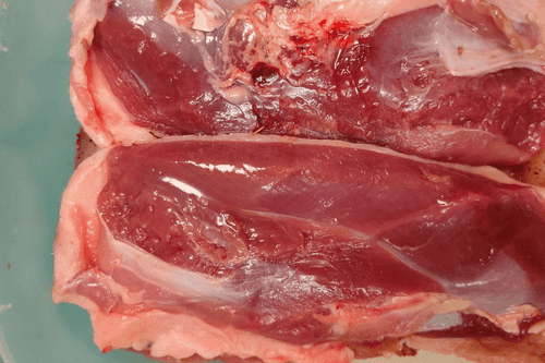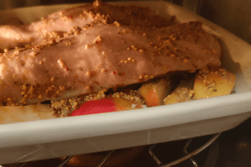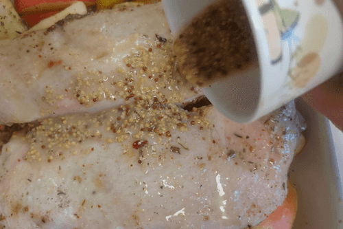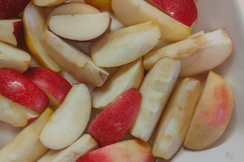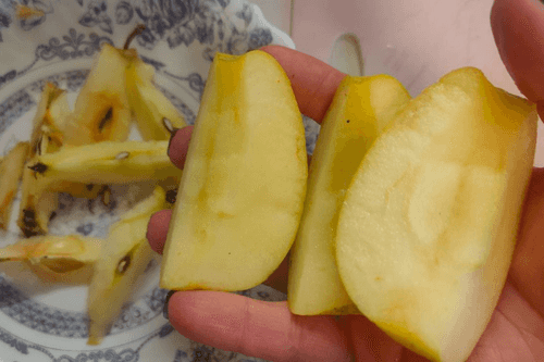 Готовую грудку достать из духовки, нарезать и подать с яблоками, разложив порционно.