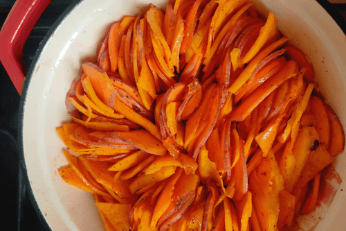 Нарезать все оранжевые овощи слайсером тонкими ломтиками, сложить в большую миску, добавить мелконарезанную курагу, масло, соль, перец, мускатный орех и имбирь, тщательно перемешать.