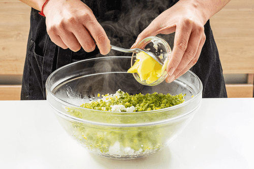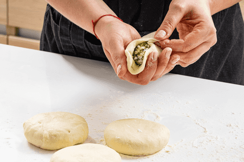 Взять кусочек теста и завернуть в него начинку, сформировав галушку. Проделать то же самое с оставшимся тестом.