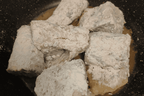 Обвалять по одному куски рыбы в муке.