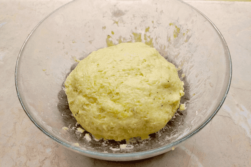 Перемешать толченый картофель, муку, яйцо, соль, перец. Дать тесту полежать 60 минут.