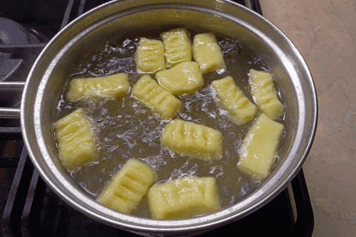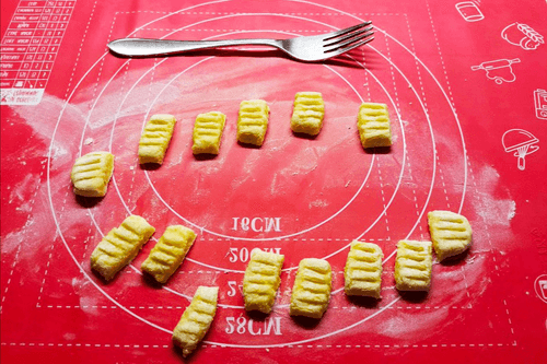 Нарезать на кружки, с помощью вилки придать форму клецек.