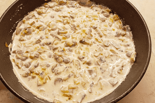 Потушить грибы с луком на топленом масле, посолить, добавить сливки, прогреть.