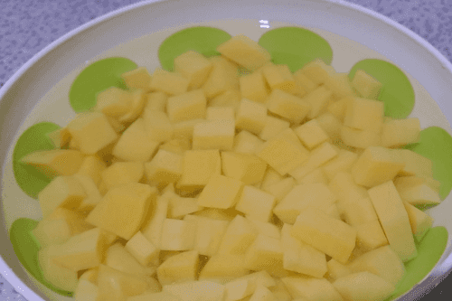Картофель очистить, хорошо вымыть, нарезать соломкой или кубиком среднего размера, залить водой и отставить в сторону.