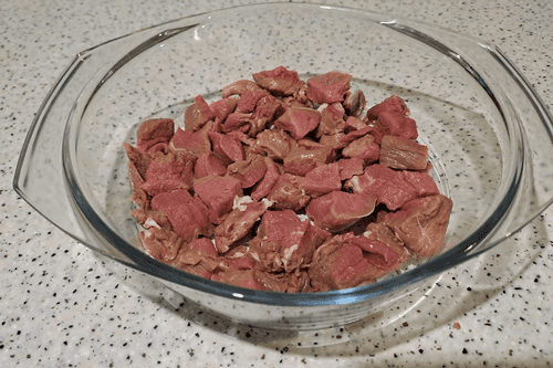 Мясо хорошо вымыть под проточной водой, просушить, нарезать порционными кусками небольшого размера, выложить в форму для запекания.