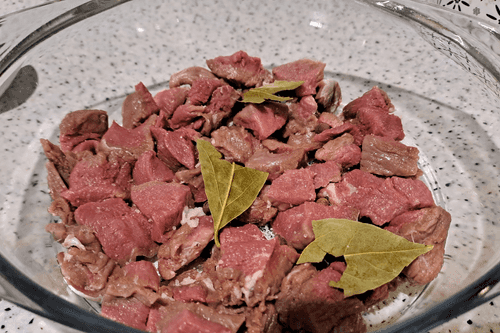 Мясо посолить по вкусу, выложить 2 лавровых листа, душистый перец горошком, молотую паприку по вкусу.