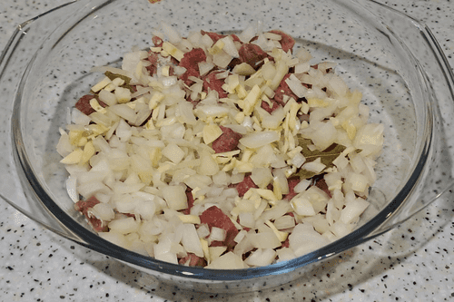 Очистить лук и чеснок, нарезать кубиком или соломкой небольшого размера и выложить в форму к нарезанному мясу.