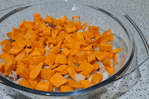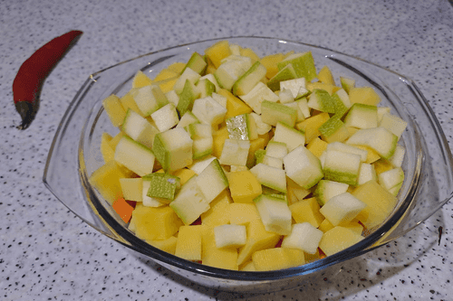 Слить воду с картофеля и выложить в форму. Молодой кабачок нарезать кубиком или соломкой и выложить в форму. По желанию добавить несколько небольших кусочков острого перца.