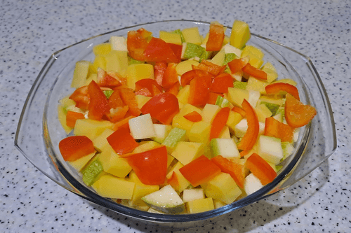 Сладкий перец хорошо вымыть, очистить от семян и плодоножек, нарезать мелкими кубиками или соломкой и выложить в форму с подготовленными ингредиентами.