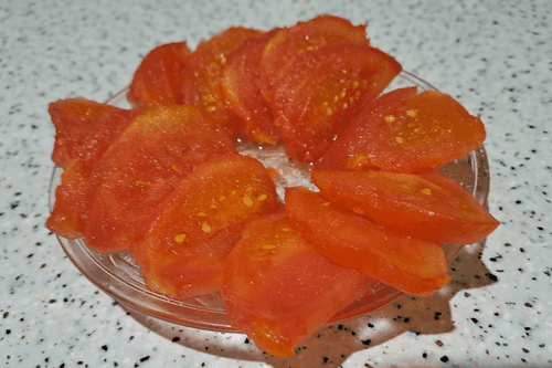 На помидорах сделать надрезы, залить кипятком на 5 минут, достать из воды, снять кожицу и нарезать дольками.