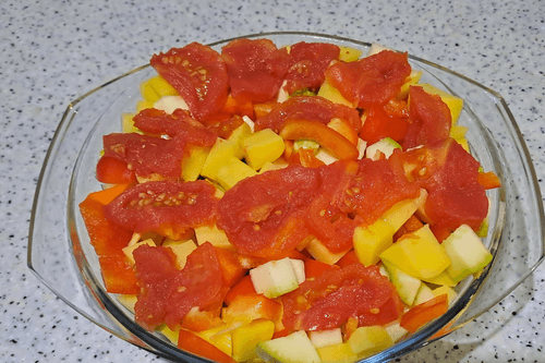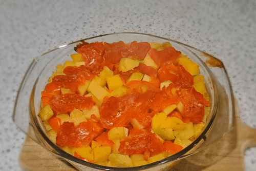 Овощи в форме немного посолить и выложить сверху подготовленные помидоры, добавить примерно 0,5 стакана томатного сока.