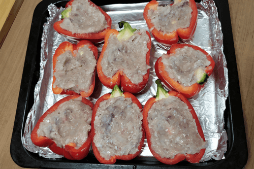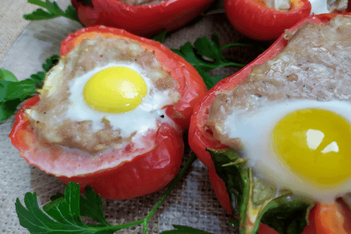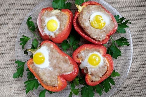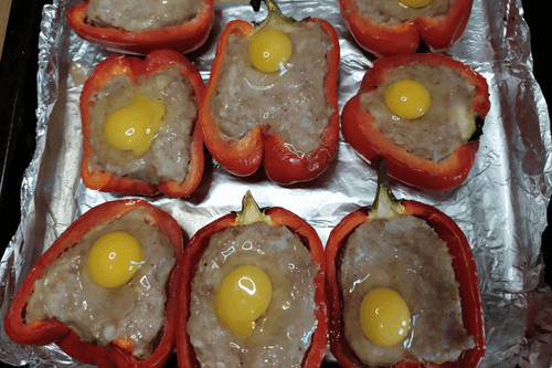 Запеченные перцы с фаршем из индейки и перепелиным яйцом