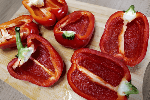 Крупный мясистый красный болгарский перец промыть, разрезать вдоль, удалить семена.