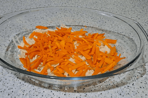 Очистить морковь, хорошо вымыть, нарезать кубиком или соломкой небольшого размера и выложить в форму для запекания.