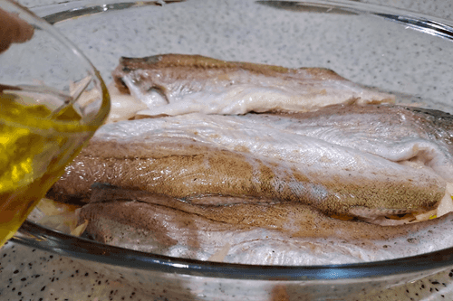 Выложить рыбу сверху на овощи и добавить в форму 50 мл растительного масла.