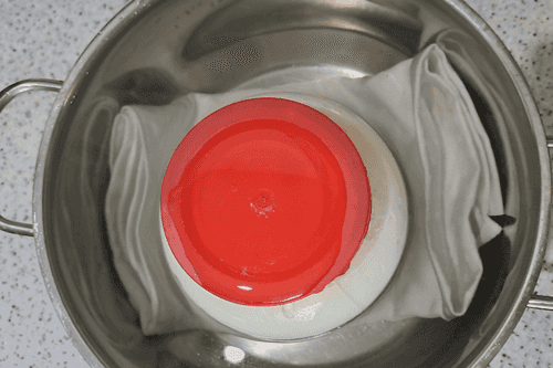 Дно кастрюли застелить кухонным полотенцем. Поставить в кастрюлю банку с прокисшим молоком. Наполнить кастрюлю водой комнатной температуры так, чтобы банка была покрыта почти полностью водой. Оставить примерно 1,5 см до верху.