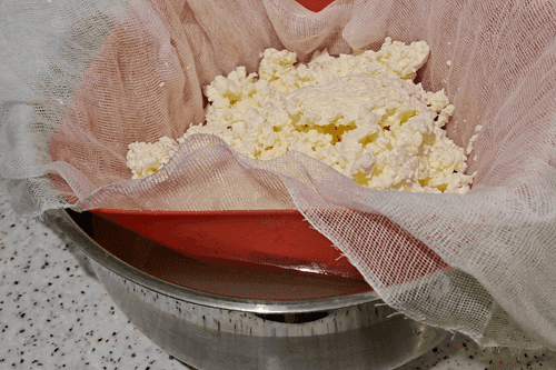 Выложить молоко в дуршлаг застеленный марлей, чтобы стекла сыворотка.
