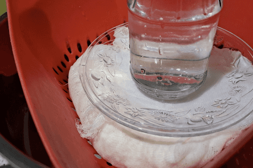 Чтобы творог получился более плотным, можно установить небольшой груз и поставить примерно на час в прохладное место.