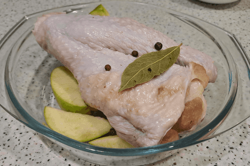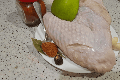 Крыло индейки хорошо вымыть под проточной водой. Чеснок очистить и выдавить через пресс. Натереть крыло чесноком, посолить по вкусу, выложить в форму 1 лавровый лист и 3 горошины душистого перца.