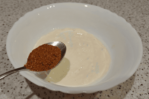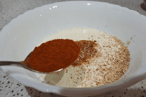 Выложить в емкость со сметаной 1 чайную ложку паприки молотой и натереть на мелкой терке немного мускатного ореха. Все ингредиенты перемешать.