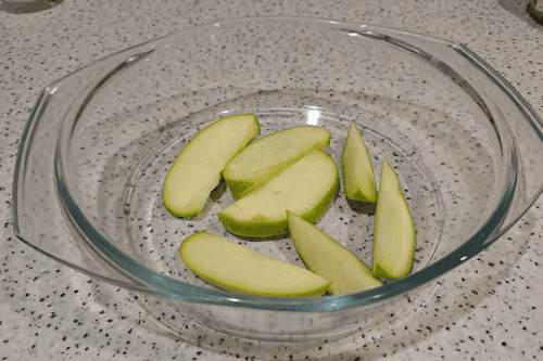 Яблоко хорошо вымыть, удалить сердцевину, нарезать дольками и выложить в форму для запекания.