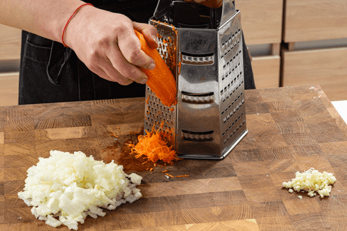 Натереть морковь на мелкой терке, мелко нарезать лук и 2 зубчика чеснока.