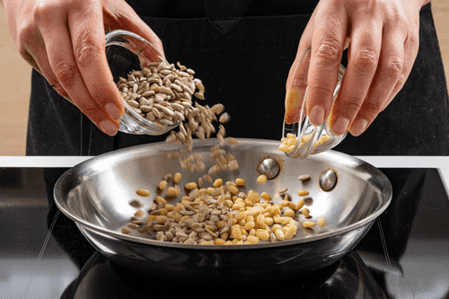 Поджарить кедровые орехи и семена подсолнечника на сухой сковороде до золотистого цвета, постоянно помешивая.