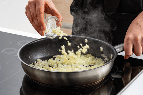 Разогреть растительное масло в сковороде и обжарить лук до прозрачности, затем добавить чеснок и обжаривать еще 1 минуту.