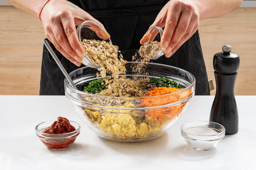 Смешать в большой миске готовое пшено, натертую морковь, зелень, овсяные хлопья, кедровые орехи, семечки подсолнечника, обжаренный лук с чесноком, томатную пасту, льняную муку, соль и перец.