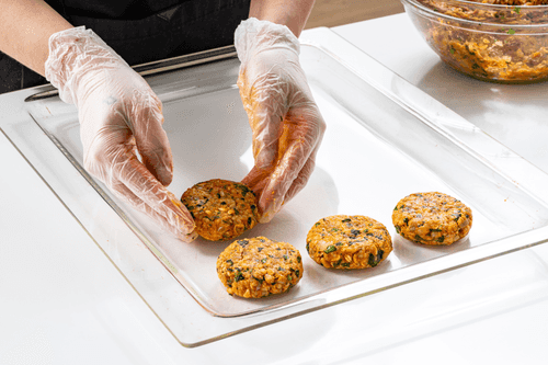 Слегка смочить руки в холодной воде и сформировать из смеси котлеты нужного размера, можно воспользоваться перчатками.