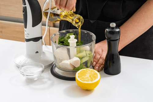 Для соуса в блендере смешать мякоть авокадо, тофу, базилик, оставшийся чеснок, лимонный сок, оливковое масло, соль и перец до получения однородной кремовой консистенции.