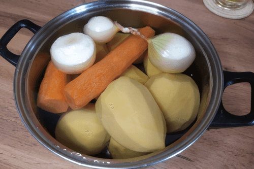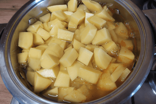 Залить горячей водой таким образом, чтобы картофель практически полностью был покрыт жидкостью. Томить на медленном огне до готовности картофеля.