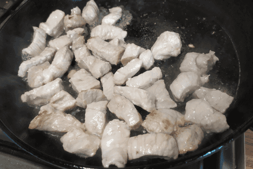 Обжарить мясо в течение 3–5 минут на раскаленном растительном масле.