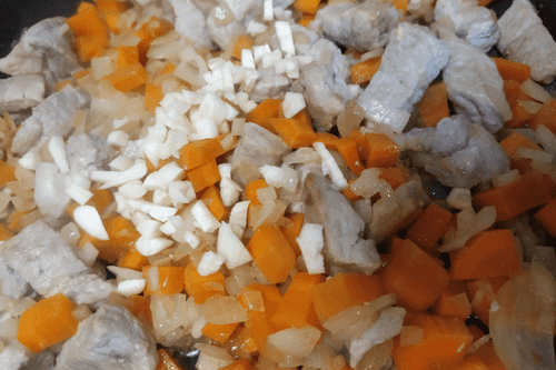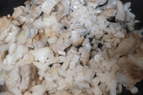 Уменьшить огонь и добавить к мясу мелконарезанный репчатый лук.