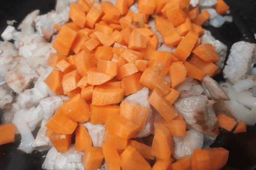Выложить мясо и овощи в кастрюлю с толстым дном.
