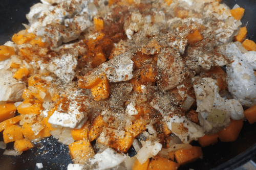 Добавить специи по вкусу — паприку, смесь перцев, соль. Перемешать и обжаривать до полуготовности лука и моркови.