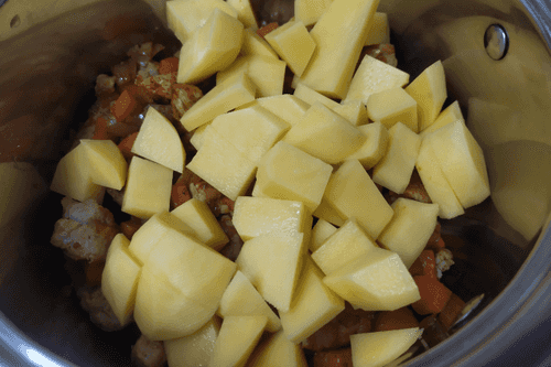 Выложить картофель, нарезанный крупными кубиками (со стороной примерно 2 см).