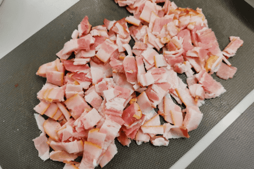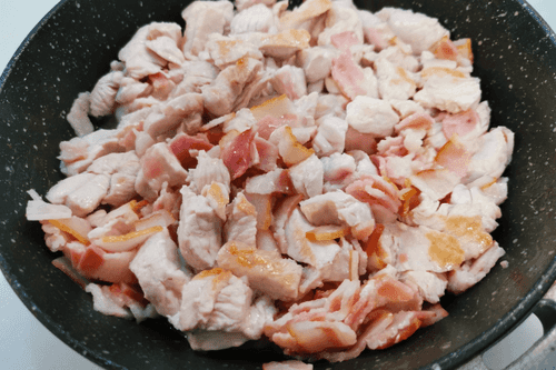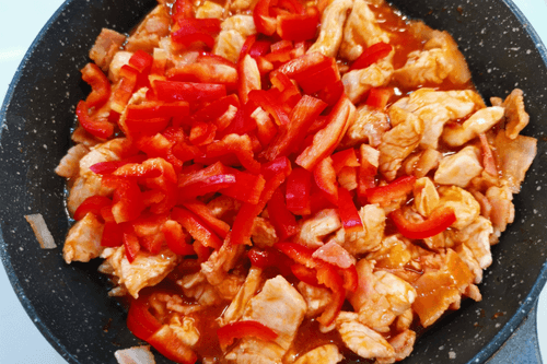 В разогретое на сковороде масло выложить некрупно нарезанные кусочки индейки.
