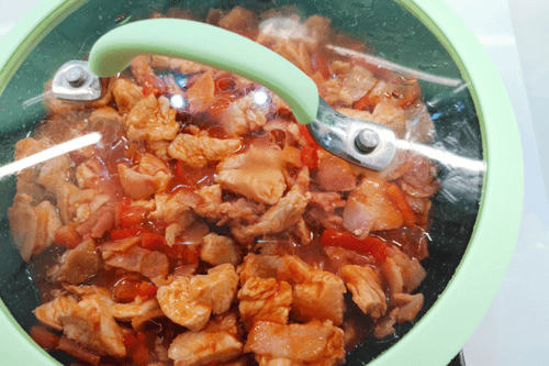 Через 1–2 минуты перемешать и убавить огонь до среднего.